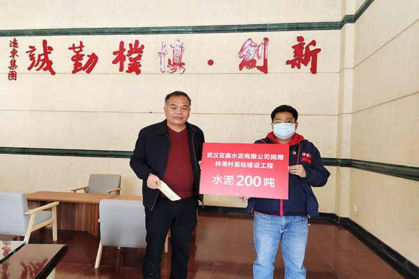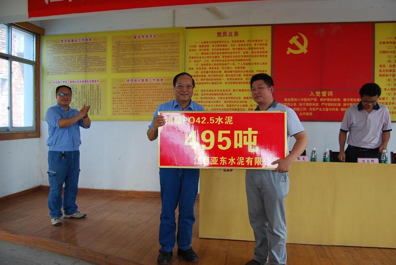 江西亞東水泥有限公司張振昆總經(jīng)理向團(tuán)結(jié)村田小兵支書頒發(fā)捐贈牌