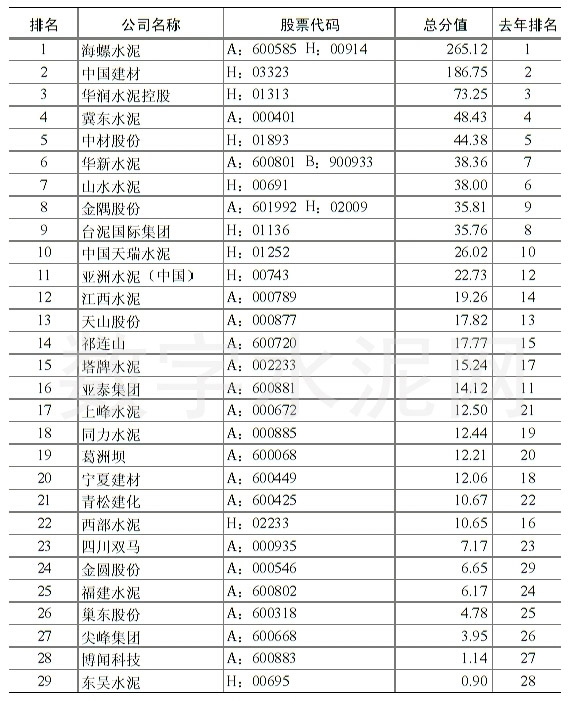 5月7日,中國水泥協(xié)會公布2015年中國水泥上市公司綜合實力排名。海螺水泥、中國建材、華潤水泥控股依然位列前三甲,前十強(qiáng)還有:冀東水泥、中材股份、華新水泥、山水水泥、金隅股份、臺泥國際集團(tuán)和中國天瑞水泥,亞泥(中國)緊隨其后,位列第11位。