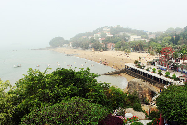 在鼓浪嶼上和大海的親密接觸是必不可少的,金黃色的沙灘,蔚藍的海水一望無際。五月的天氣正值鼓浪嶼旅游的旺季,所以沙灘上的人也特別多,大家紛紛脫掉鞋襪,奔向大海,踏著浪花,吹著海風(fēng),頂著明媚的陽光,盡情的嬉戲,每個人臉上都綻放著燦爛的笑容,笑聲和浪聲譜寫成一曲美妙的交響樂。